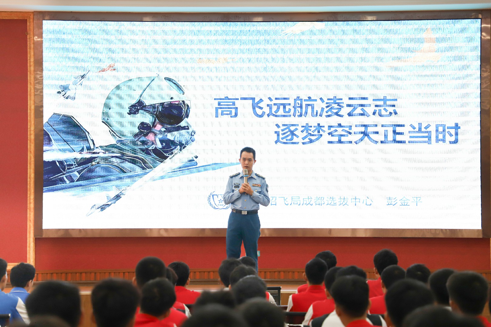 宣讲会现场,空军招飞局成都选拔中心彭干事以“高飞远航凌云志,逐梦空天正当时”为主题,围绕“空军在战争中的地位和作用”“招飞简介”“职业发展及福利待遇”“基本条件和选拔程序”四大维度展开详细解读。