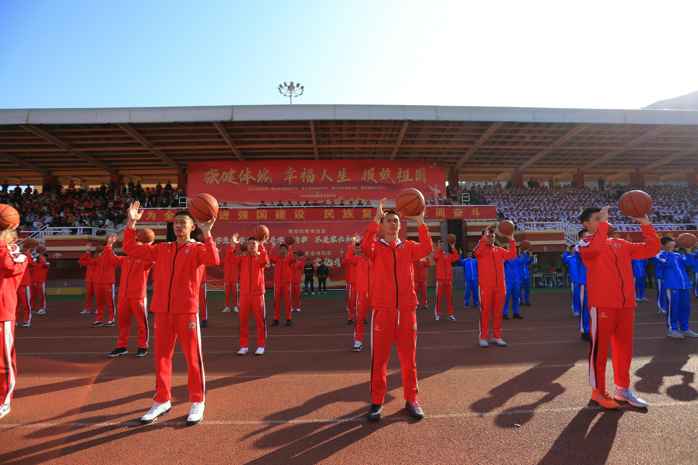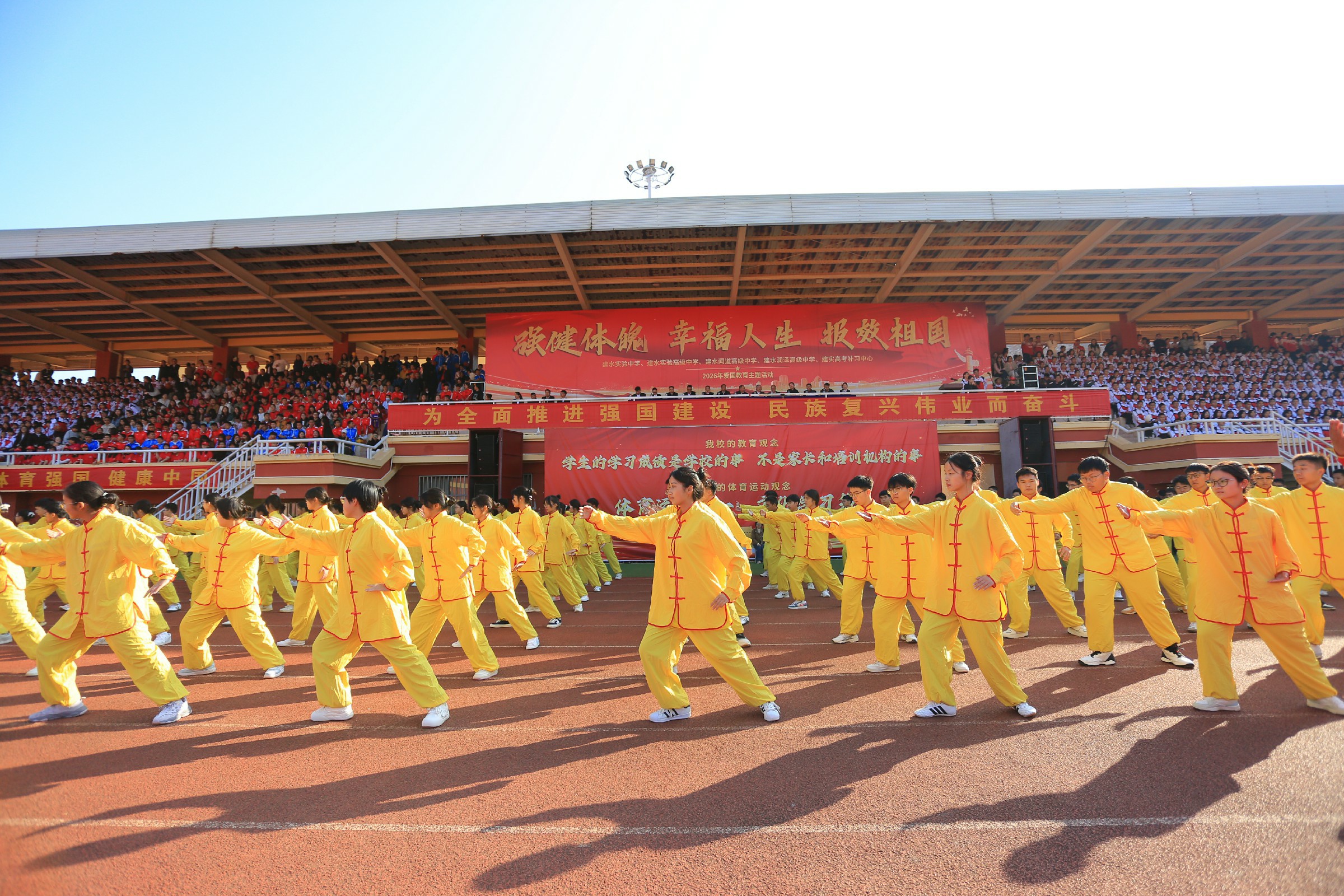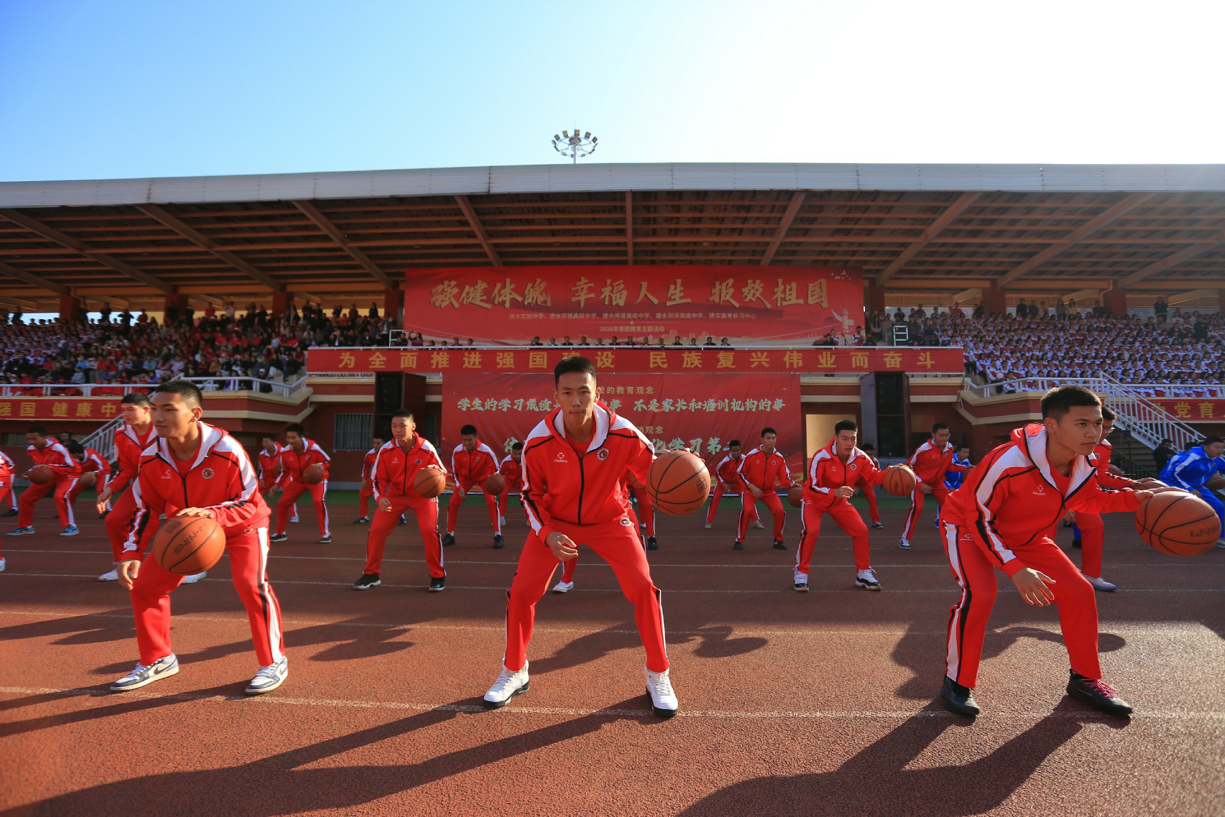 活动在庄严的国歌声中拉开帷幕,篮球方队、健身操方队、太极拳方队依次亮相。从屡夺省级篮球赛事桂冠、多名师生入选国家篮球集训队的篮球健儿奋勇争先的身姿,到健身操迸发的青春活力,再到太极拳承载的中华优秀传统文化底蕴,每一个身影都彰显着建实学子“野蛮其体魄”的自觉,每一次跃动都诠释着“文明其精神”的追求。
